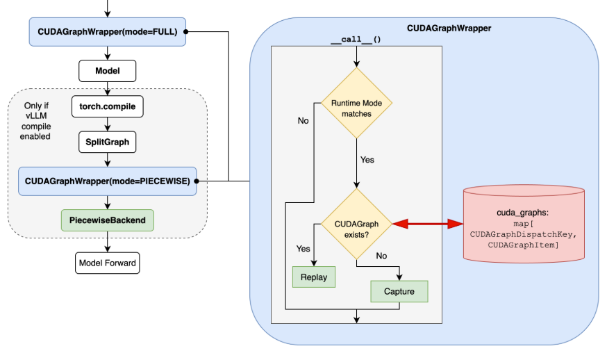 NONEor runtime_mode does not match the mode of the wrapper, just call the runnable directly. - Otherwise, i.e., the runtime_mode matches the mode of the wrapper, the wrapper will perform CUDA Graphs capture (if key does not exist, create a new entry and cache it) or replay (if key exists in the cache).